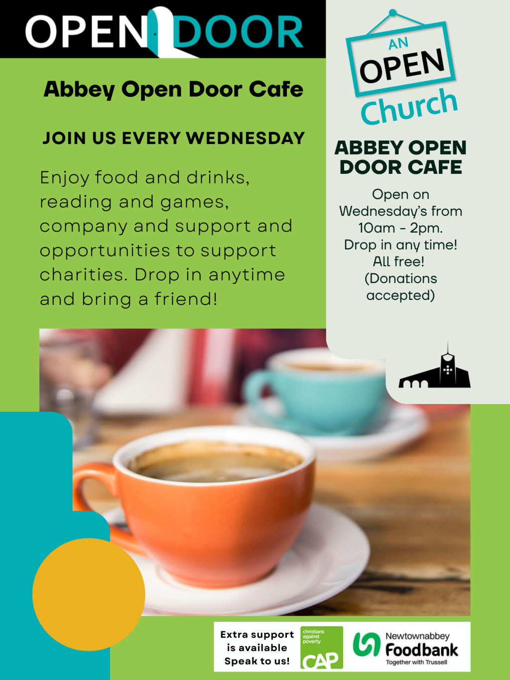 The Open Door Cafe is a new ministry. As part of our vision of being an open Church – we want to open our doors to the local community. Our doors are open on a Wednesday morning from 10.30am – 12pm for tea, coffee and chat.